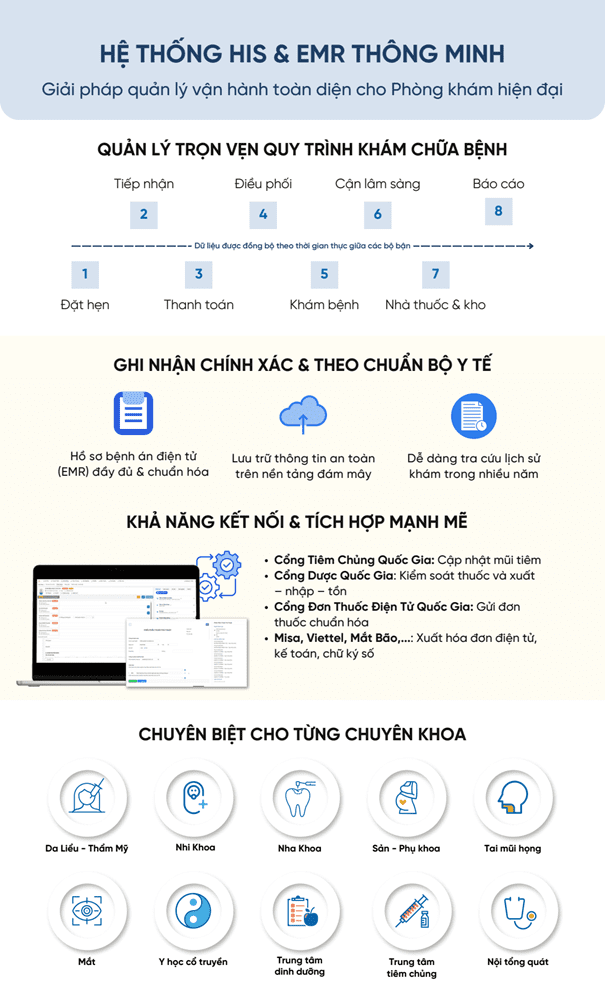 Phần mềm giúp quản lý phòng khám với toàn bộ quy trình vận hành từ khám chữa bệnh – chăm sóc khách hàng – phân tích dữ liệu trên một hệ thống thống nhất, sẵn sàng liên thông Bệnh án điện tử, Hóa đơn điện tử, và Bảo hiểm y tế theo các Quy định được ban hành của Bộ Y tế.