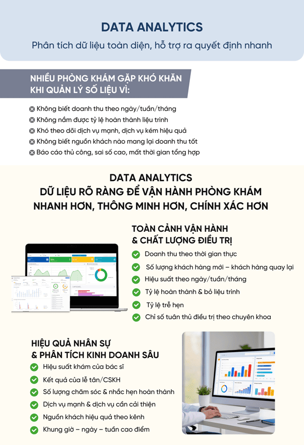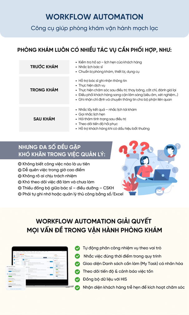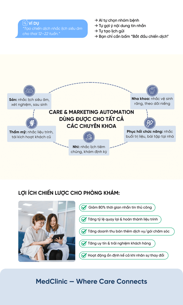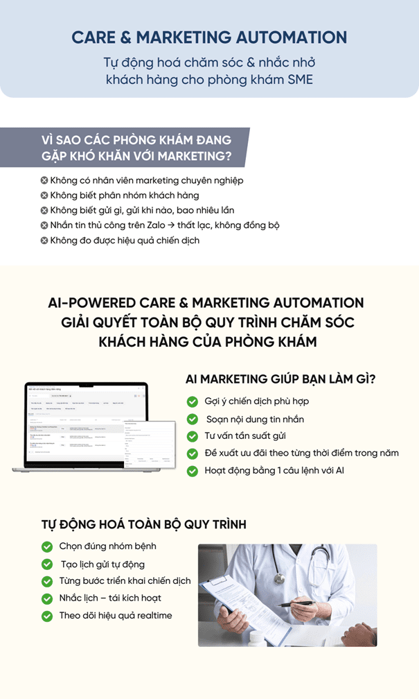 • Tự động hoá Chăm sóc khách hàng (CSKH) và tiếp thị sau khám;