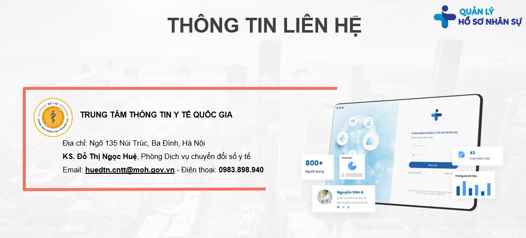 Trung tâm Thông tin y tế Quốc gia đã hợp tác với các doanh nghiệp trong lĩnh vực công nghệ thông tin nghiên cứu, xây dựng phần mềm Quản lý hồ sơ nhân sự. Phần mềm bao gồm các chức năng đáp ứng nghiệp vụ về công tác quản lý cán bộ cho các đơn vị trong và ngoài ngành y tế.